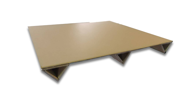 Vパレットは意匠登録済みの新型V桁を使用することで、安価に提供することができるダンボールパレットです。荷重500kg以下で、あまり重いものを載せない場合の選択肢として、価格相応の性能を有しています。ワンウェイ利用メインで2方差しで利用できます。保管時はシート状で、使用時に桁を起こし、テープで留めるだけの簡単ハンドリング。1分以内にぱパレット状にすることができます。